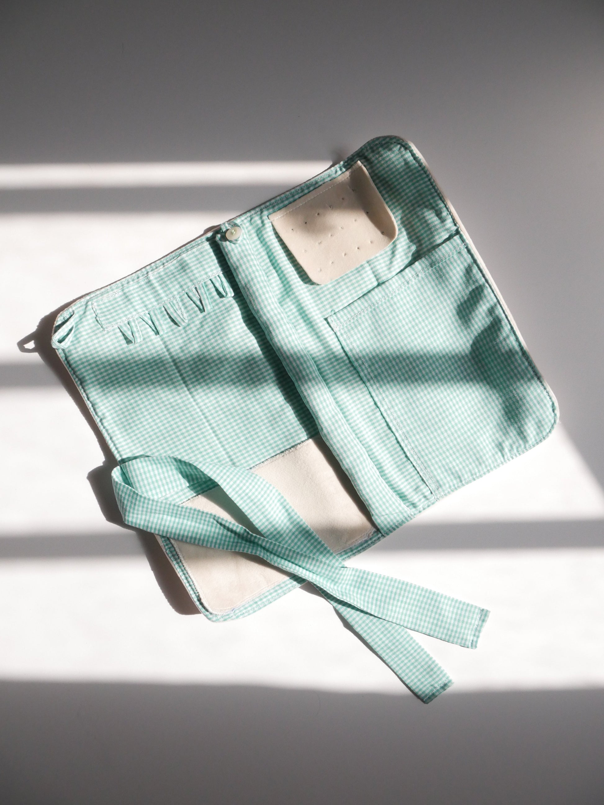 El diseño de este joyero de viaje es en forma de pergamino, se cierra con una cinta del propio tejido de la parte interior.